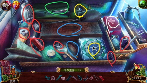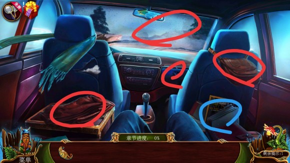 挡风玻璃下的面板,用到切开——钥匙,用钥匙开左下角的盒子,进入找物游戏——安全锤
