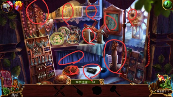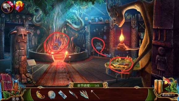 树右边的三角柜子点开,右下角玻璃柜——老者面具,左下角玻璃柜——图画碎片