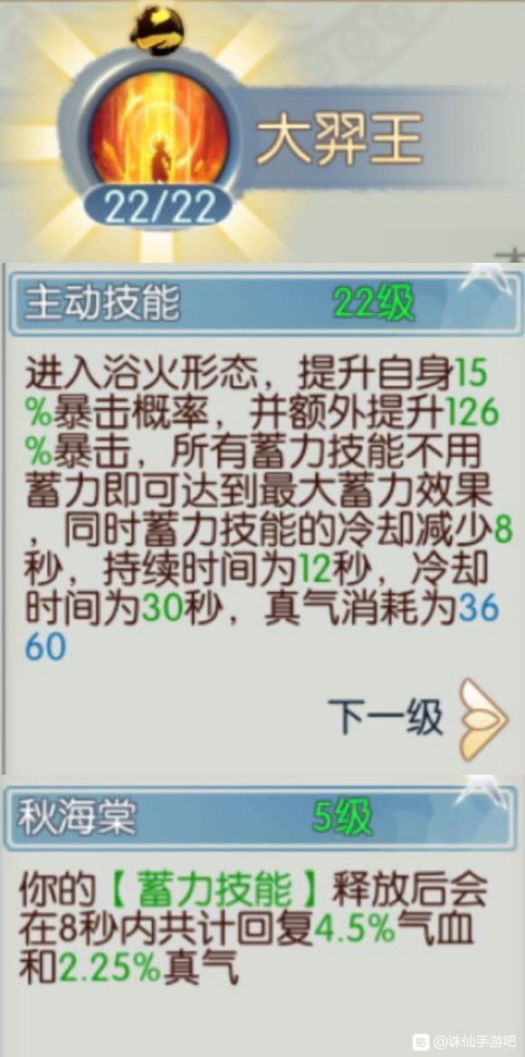 烈山核心buff技能,大羿王期间两个主要需要蓄力的输出技能赤乌坠和轮回闪全都不需要蓄力,并且增加大量暴击和暴击率,堪比合欢缠绵,弥补了烈山暴击低的缺陷。大羿王持续期间,能够打出4次赤乌坠和2次轮回闪。烈山的技能利用率很低,封神技能的存在感也较低,给人的感觉像是只有赤乌坠和轮回闪两个技能,而无论是输出还是辅助效果也主要都集中在这两个技能上。