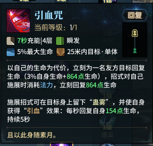 总评:引血咒是重要的单抬治疗、填充技能和铺雾手段。