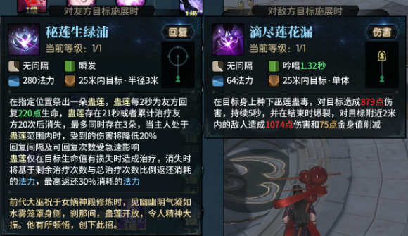 【改动】:删除了“引血”效果;增加“废花回收机制”,最高返30%法力(其实很少);自带原“幽莲”残卷效果(所以其实大小是半径4米,描述是错的)